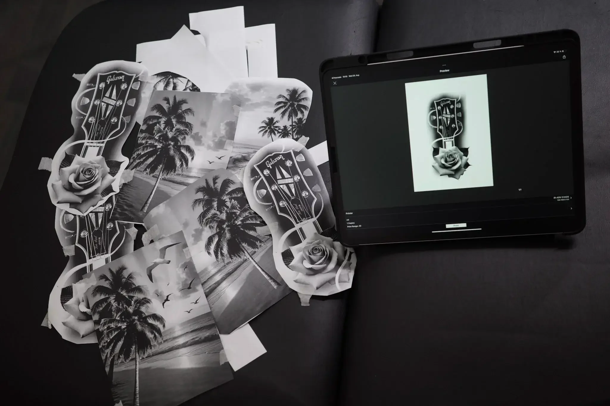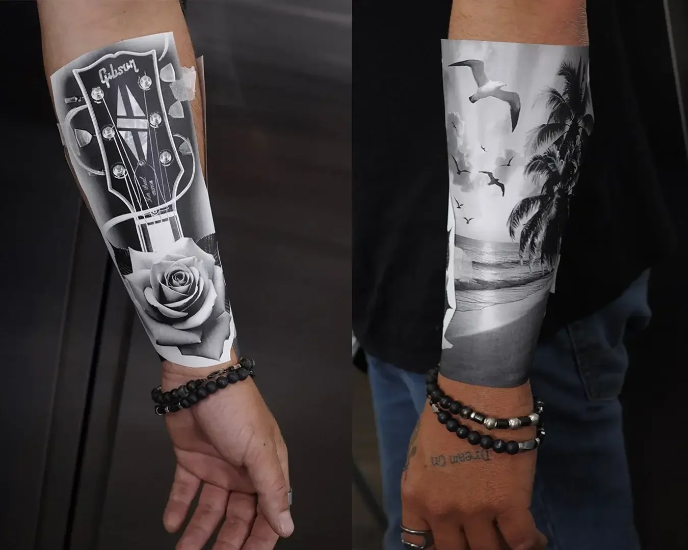 As we tested different placements and combinations, Travis realized something important: he no longer wanted the Santa Monica Pier or the Las Vegas sign on his forearm. Instead, he decided to keep those elements for a future upper-arm piece and replace them with a Gibson guitar headstock and a rose, symbols that meant more to him personally.